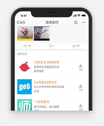 目標用戶使用手機客戶端瀏覽微博時,可直接在微博客戶端點擊卡片,進放應用市場下載APP,安裝在手機上,簡單流暢,降低APP推廣成本。